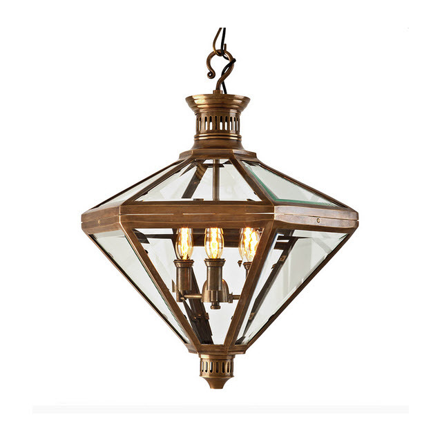 Подвесной винтажный фонарь. Материал - латунь. Три лампы освещения. Оригинальная форма в виде шестиугольника.